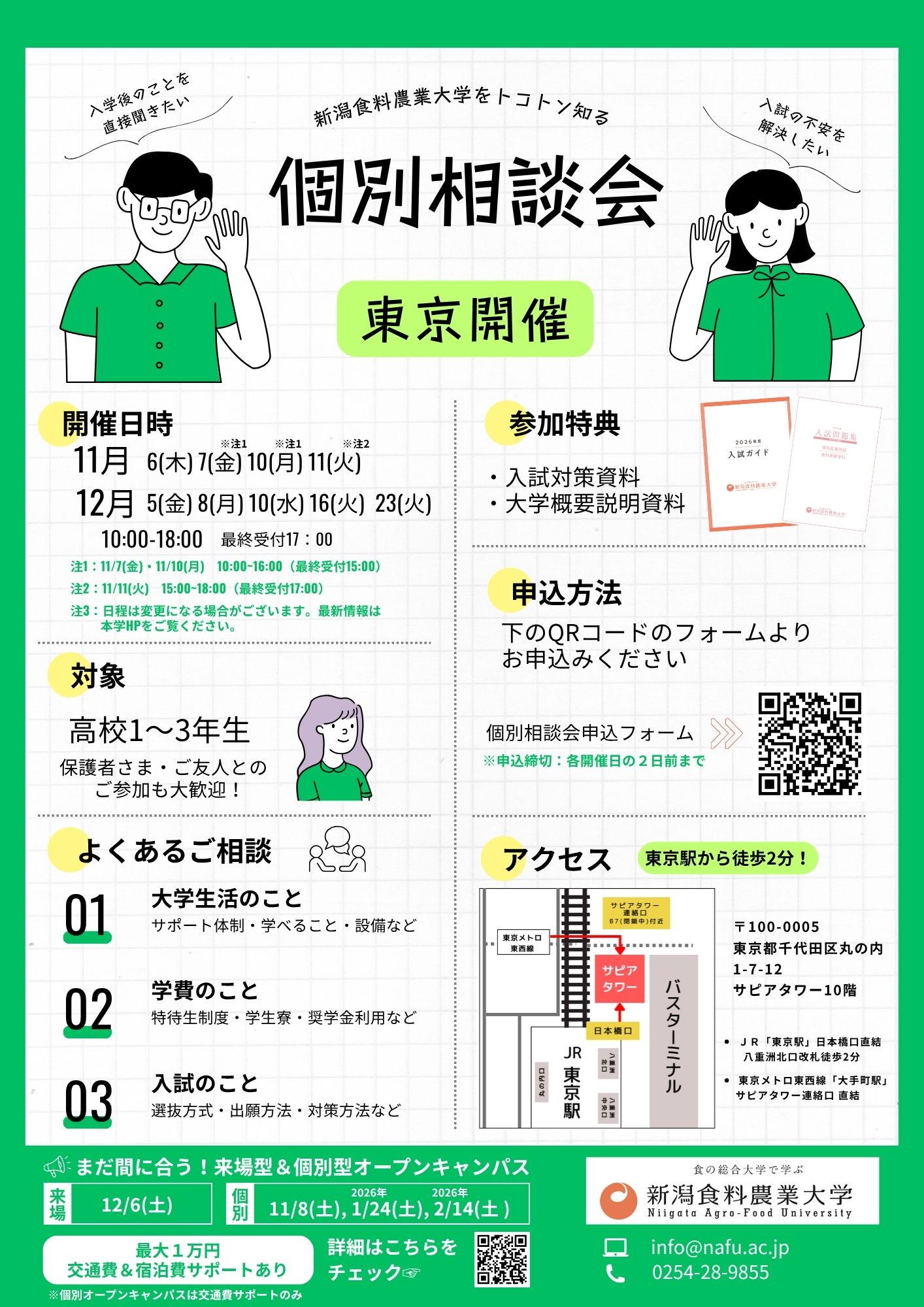 『入試の不安を解消したい』、『入学後のことを直接聞きたい』、『関東に住んでいてなかなか新潟までいけない』そんな方に東京会場の個別相談会のお知らせです。