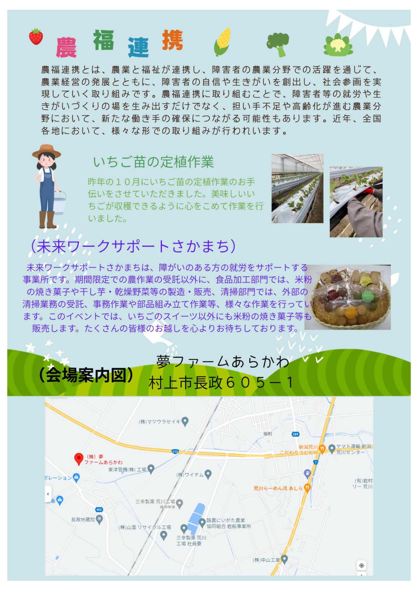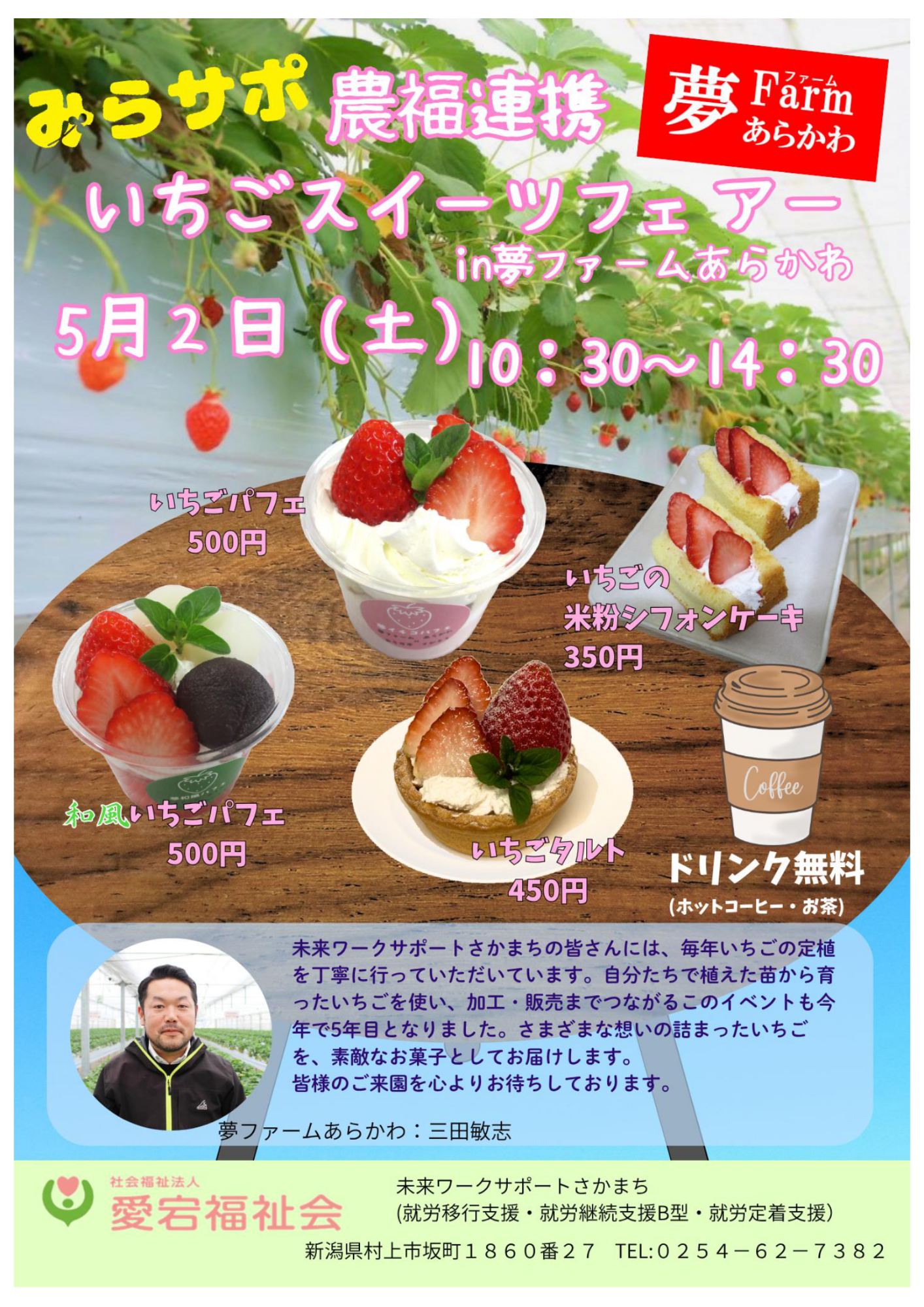 2026.04.29 イベント情報 本学学生が参加! 農福連携 いちごスイーツフェア in夢ファームあらかわ(5月2日開催) 5月2日(土)、社会福祉法人 愛宕福祉会「未来ワークサポートさかまち」主催による、いちごをテーマとした農福連携イベントに、本学学生が参加します。 農業と福祉が連携し、新たな価値を生み出す取り組みとして注目されている「農福連携」。本イベントでは、いちごを通じて、その魅力や取り組みを体験できる内容となっています。 ぜひ会場へお立ち寄り下さい。 ▼イベントの詳細は、以下のチラシをご覧ください。 News一覧へ