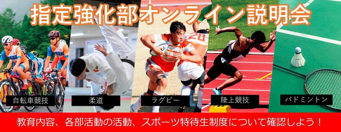 本学では【自転車競技部】【柔道部】【男子ラグビー部】【陸上競技部】【バドミントン部】が指定強化部として活動し、監督・外部コーチの指導のもと、全国大会での上位入賞を目指しています。この度各指定強化部の活動に興味があり、本学の受験を検討している方を対象としたオンライン大学説明会を開催します。部活動の説明はもちろん、大学概要や取得資格、就職実績、入試情報、学費減免のスポーツ特待生制度について詳しくご説明します。