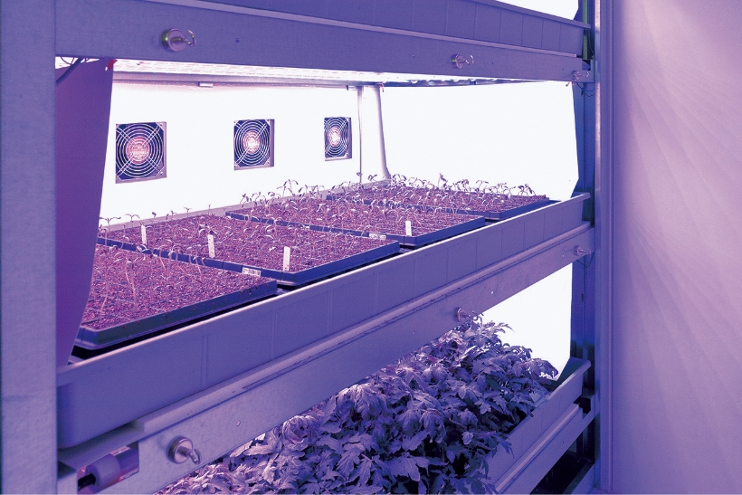 温度、湿度、CO2 濃度、養液や光条件など植物の生育に必要な条件を調節することができます。これを用いて栽培条件を組み替え、野菜類の成長促進や育苗の最適条件などについて様々な研究を行うことができます。