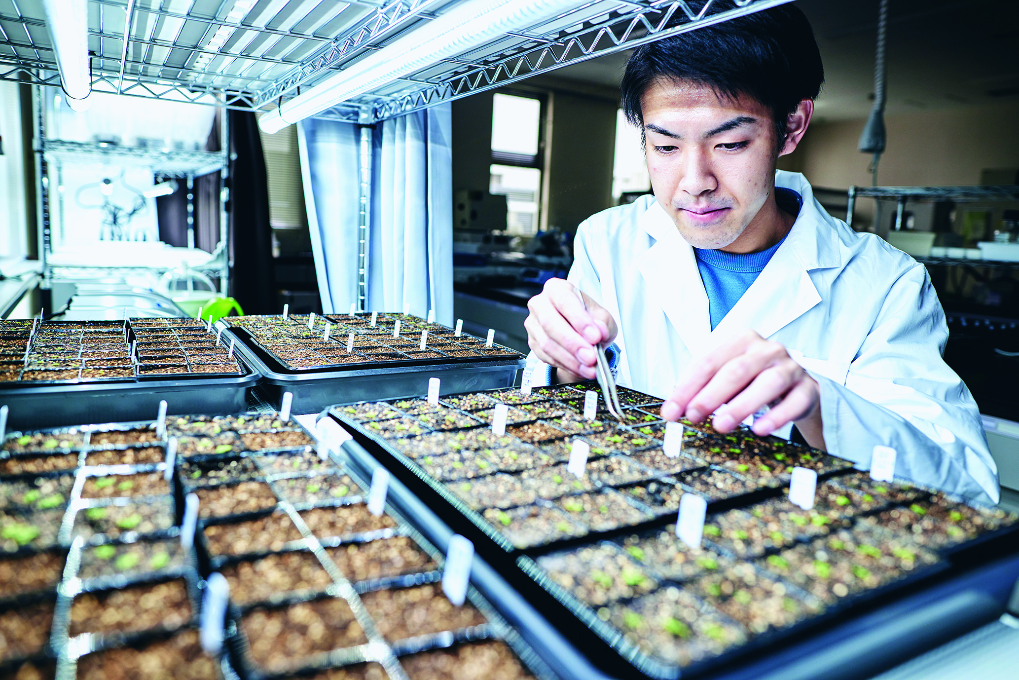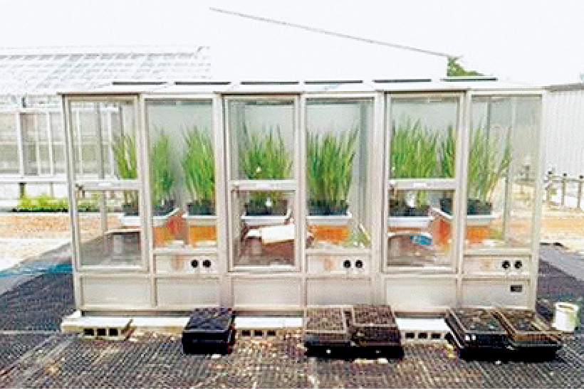 植物の生育は温度、光、水、CO2などの環境に大きく左右されます。本学には①実験室、②温室、③屋外の各レベルにおいて植物生育環境実験に用いる機器や装置が備わっています。これらを組み合わせることで、個々の環境要因が複合的に作用する実際の水田の畑における作物生育のしくみを詳細に解析することができます。得られた知見は、SDGsに関連する研究や教育効果の向上にも繋がっています。