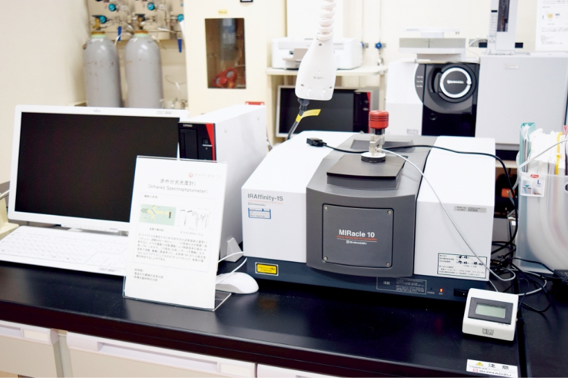 観察する物質に赤外光を当て、光の透過や反射する光の量を測定して分析・定量を行うことができます。食品などに使われる容器包装材料(フィルムなど)の分析や食品中の異物の特定に使用されています。