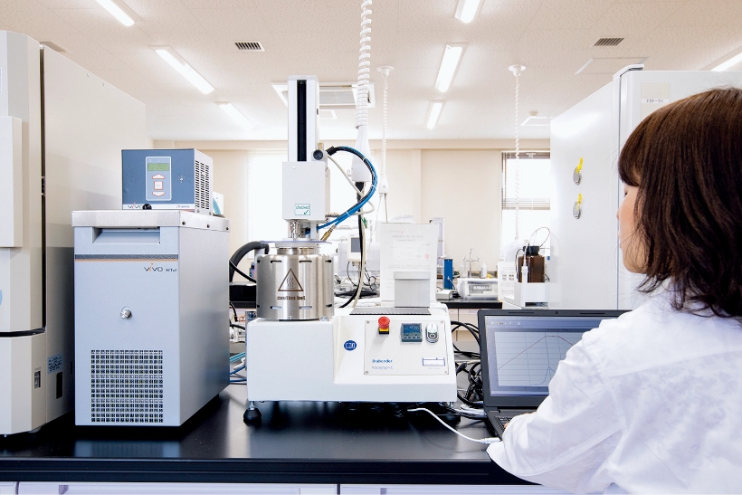 食品の加工(加熱、分離、乾燥など)に伴う物性(粘度、固さ、色調など)の変化を各種の測定機器により測定・解析を行う研究室です。レオメーター、粘度計、色差計、熱分析計などの食品加工研究に必要となる測定機器が揃っています。