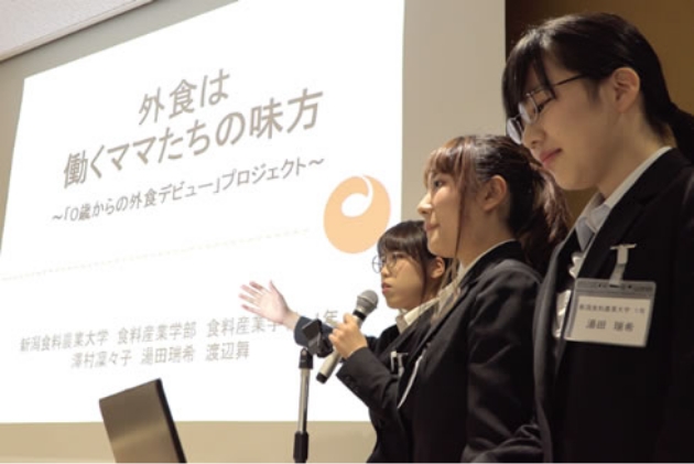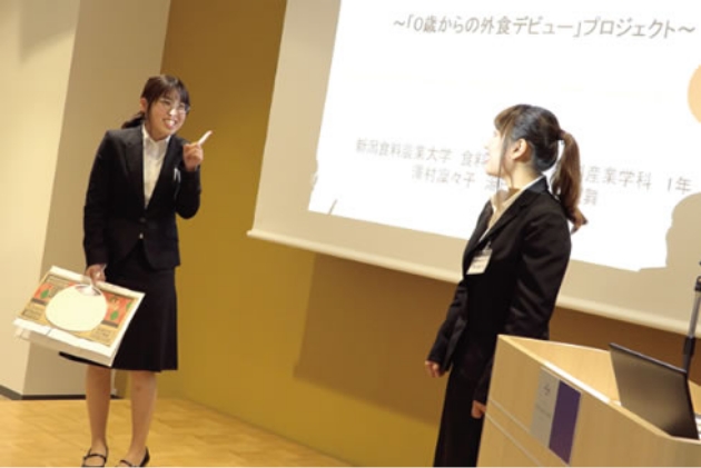 私たちは、大学生が考える明るい外食産業をテーマにした「外食インカレ」というビジネスコンテストに参加しました。テーマは「外食は働くママの味方~0歳からの外食デビュー~」。最終選考に残り、全国大会で最終プレゼンを行いました。そして138チーム中の4位である奨励賞を受賞することができました。