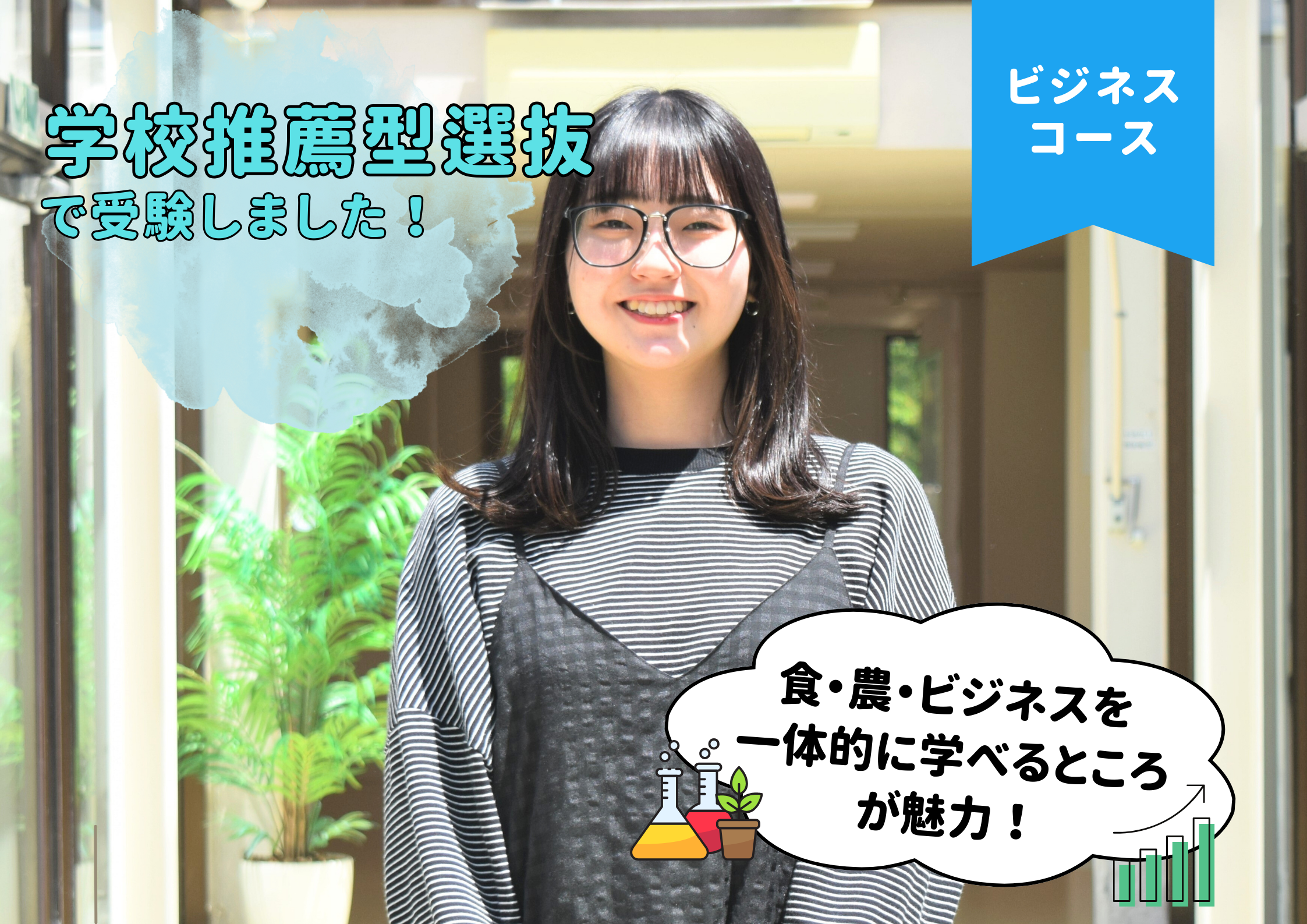 高校では野菜や果樹、花卉や畜産など農業のことを幅広く学びました。そこで、6次産業化に興味を持ち始め、加工や流通の勉強もしたいと思うようになり本学を志望しました。その中でも、「食・農・ビジネス」を一体的に学べるところが一番の決め手です。