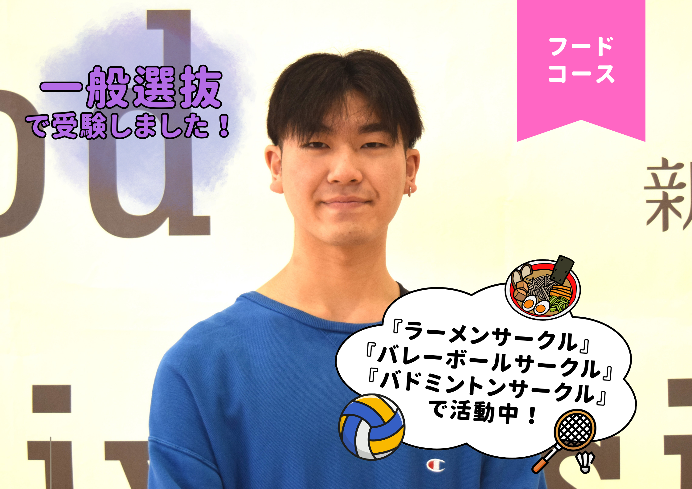 アルバイトとサークル活動の両立を頑張っています。アルバイトは基本的には土日、平日も講義がない時はたまに入っています。また、サークル活動では「ラーメンサークル」「バレーボールサークル」「バドミントンサークル」に入っています。「バドミントンサークル」は自分で立ち上げました!それぞれ週に1回程度活動を行っています。