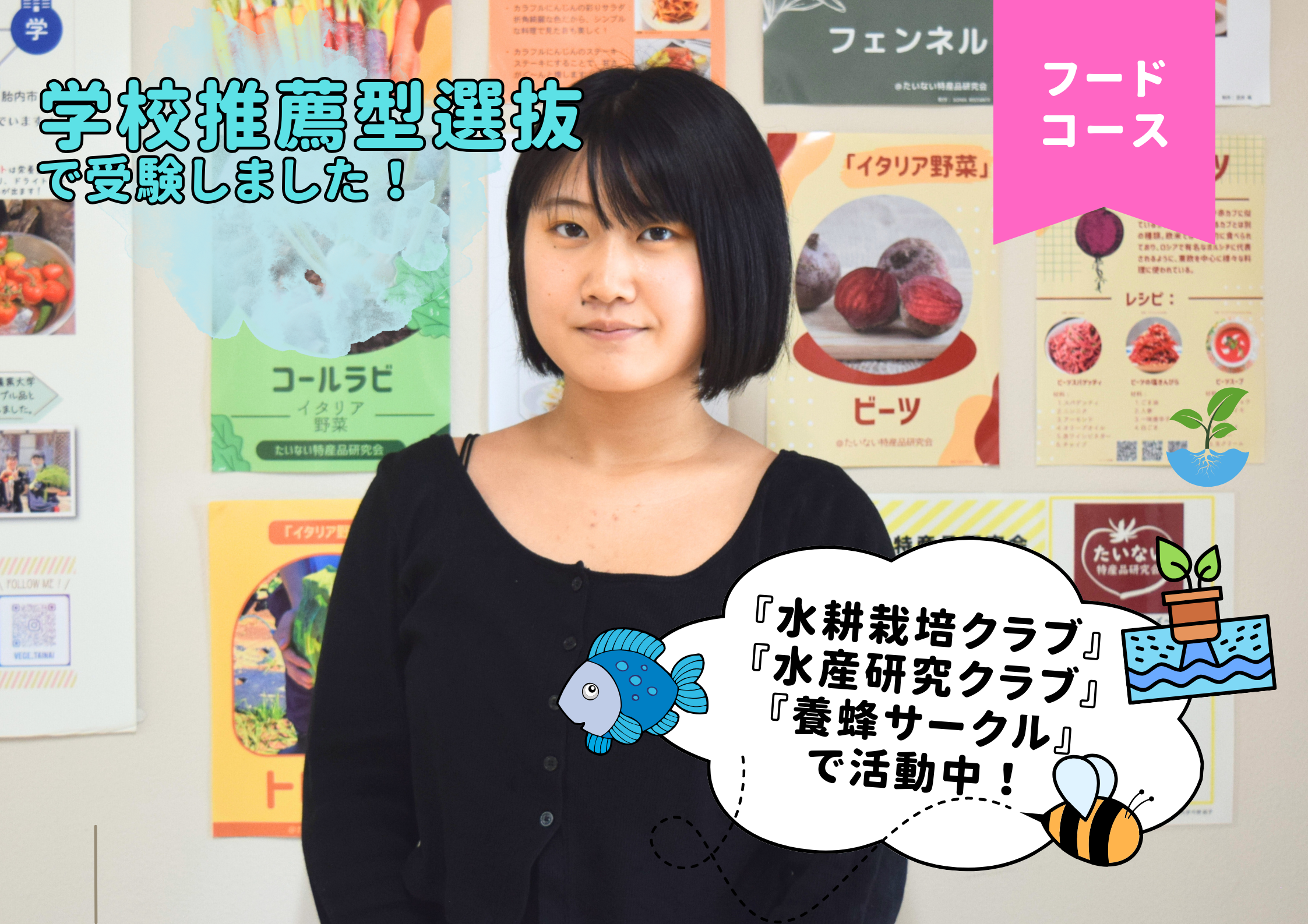 現在の小さな目標としては、祖母に自分で作った安全な野菜や料理を食べてもらうことです。この目標を実現するために、食・農業分野への進学を決めました。