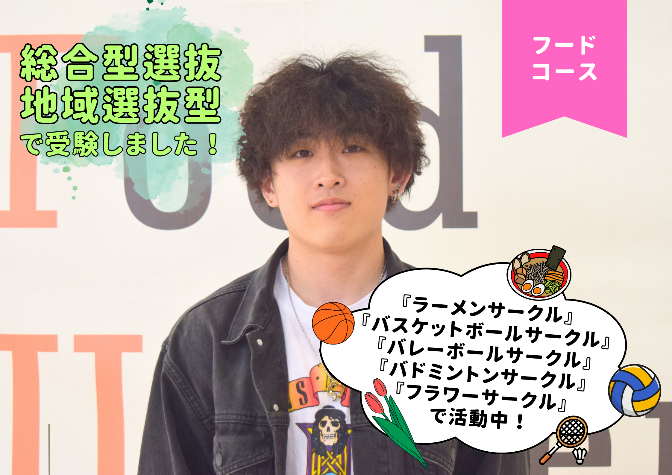 授業がない時は、トレーニングやコンビニでのアルバイトを頑張っています。また、「ラーメンサークル」「バスケットボールサークル」「バレーボールサークル」「バドミントンサークル」「フラワーサークル」に所属しており、サークル活動がある日はできる限り活動に参加しています。とにかく身体を動かすことが好きです!それでもやることがない日は家でぐーたら過ごしています。