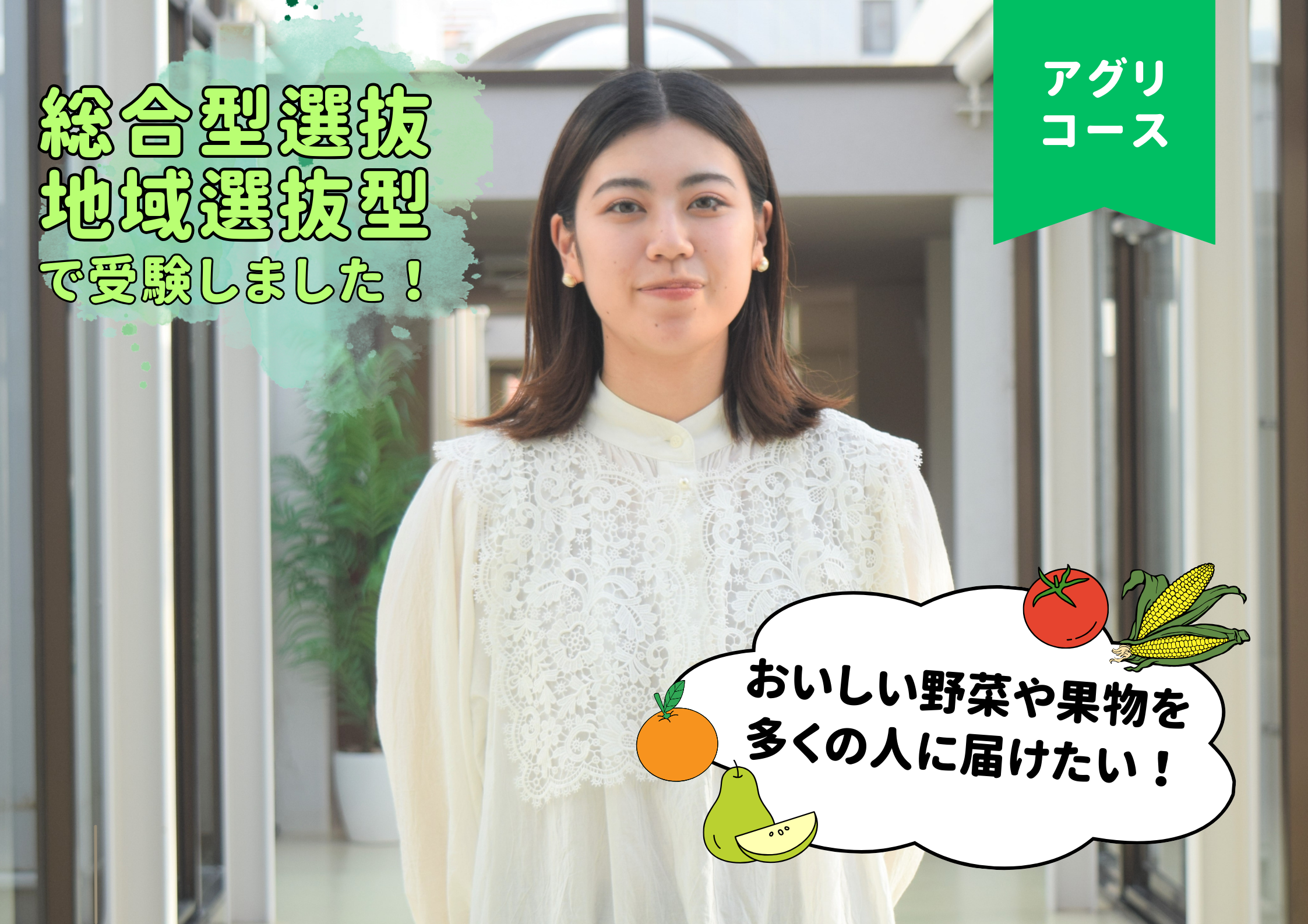 祖父母の家が米農家で、元々農業に触れながら育ちました。そのため、農業の大変さも分かっていましたが、高校生の時に祖母と一緒に野菜を一から育て、実った時の達成感と嬉しい気持ちが忘れられず、将来は「野菜や果物を育てたい!」「おいしい野菜や果物を作って多くの人に食べてもらいたい!」と、農業分野への進学を決めました。