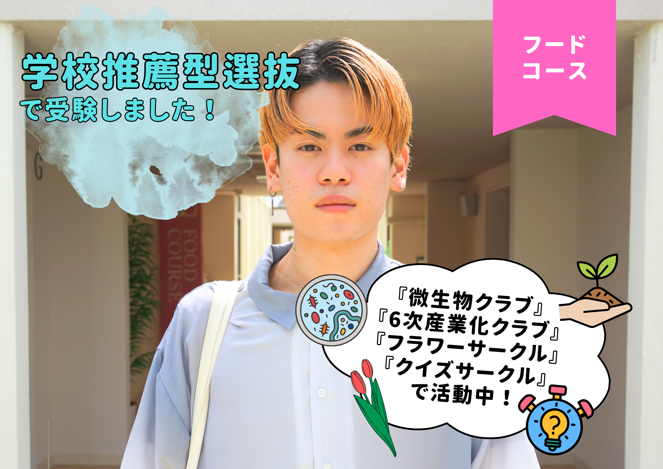 食は生きていく上で絶対必要なものであるため、食品について学びたいと思い農業高校に進学しました。高校では食品科学科に所属しており、食品分野について学んでいました。食品についての知識をさらに深め、さらには高校では学ぶことができなかった食の流通についても興味があったため、食や農業分野への進学を決めました。