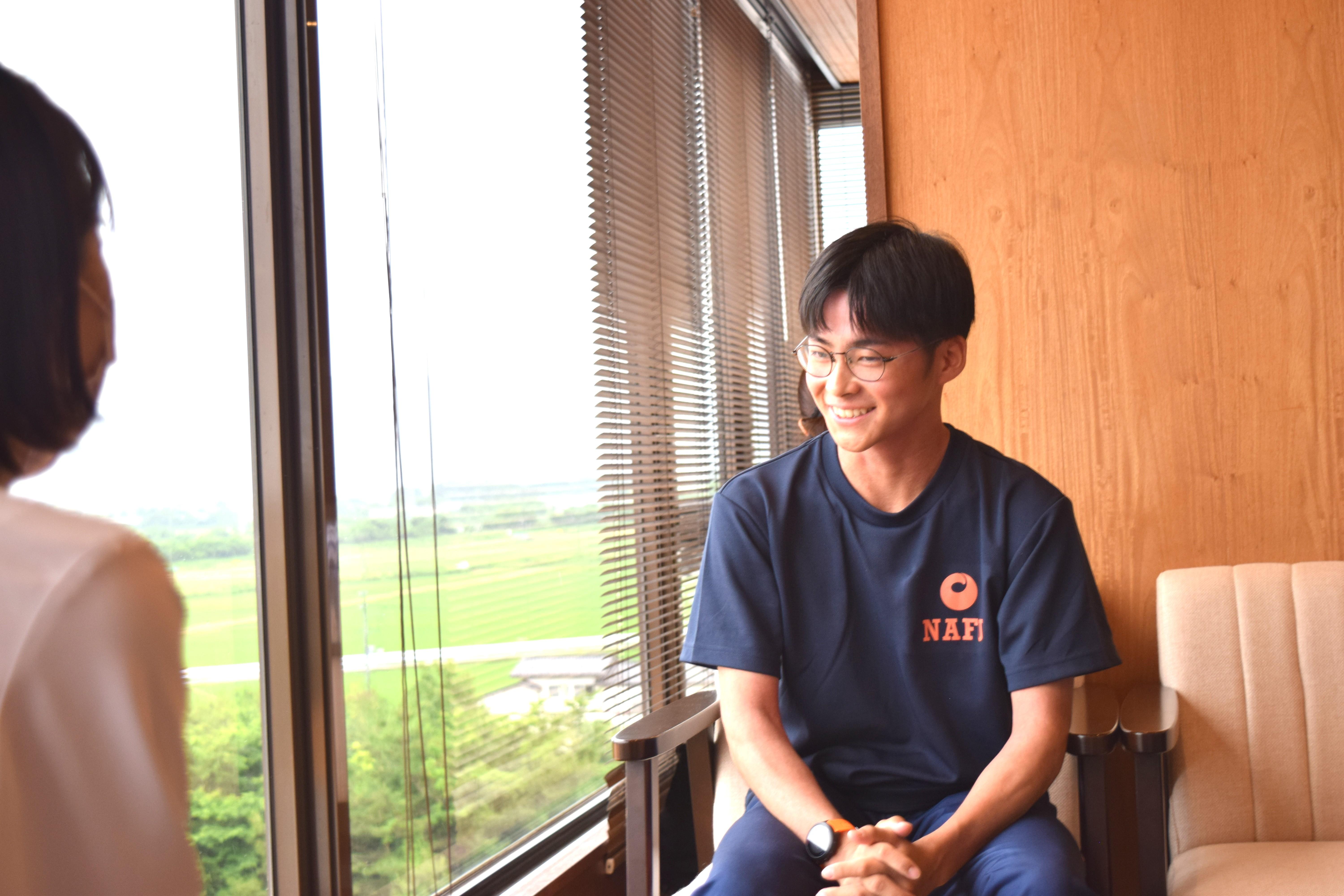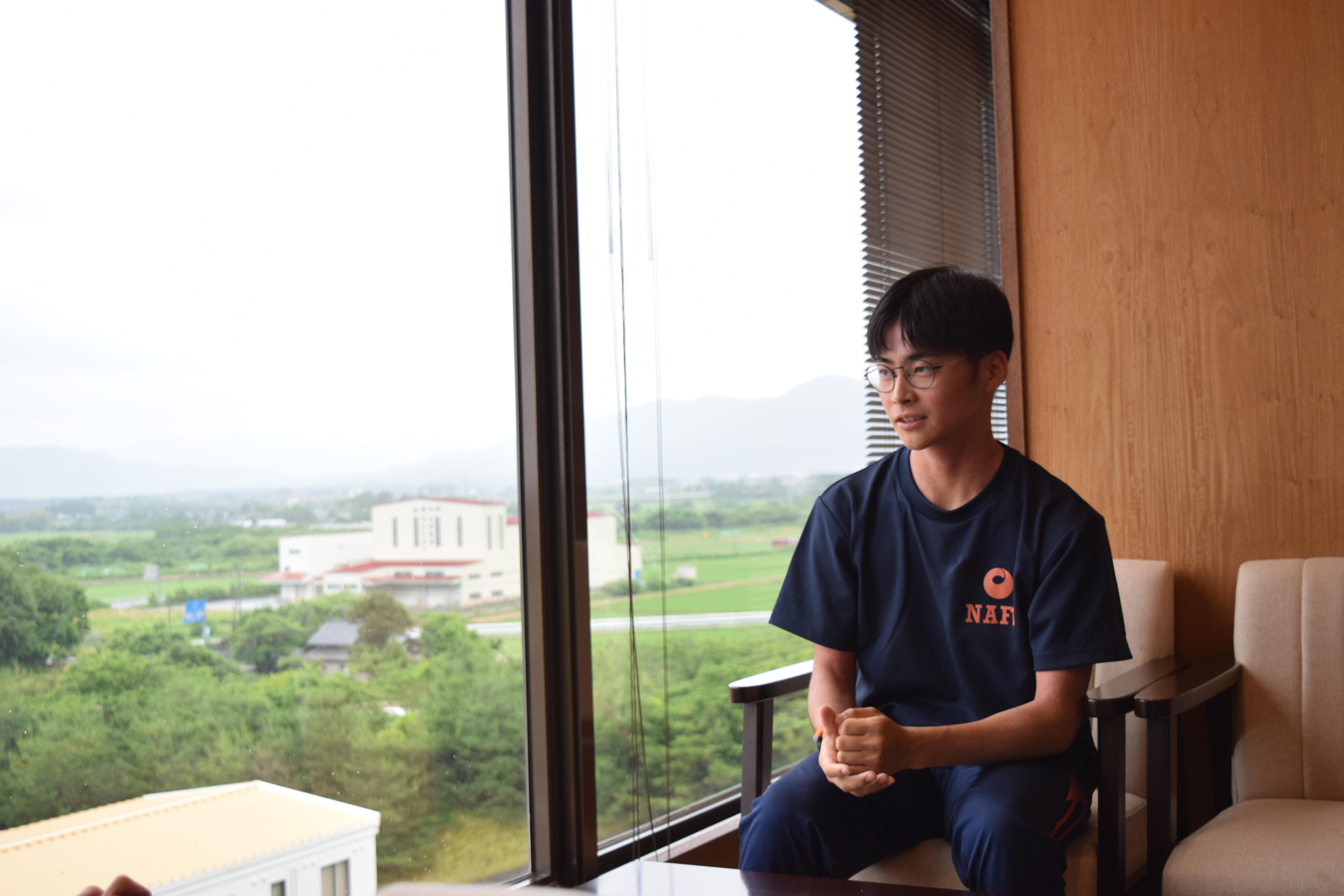 2025年4月に入学した、谷村 瑛基さん。愛媛県宇和島市出身でふるさとの魅力を共創し、関係人口を増やし将来の世代までつなげていきたいという想いから『ブーメランカレッジ』という学生団体のメンバーとして活動に取り組んでいます。