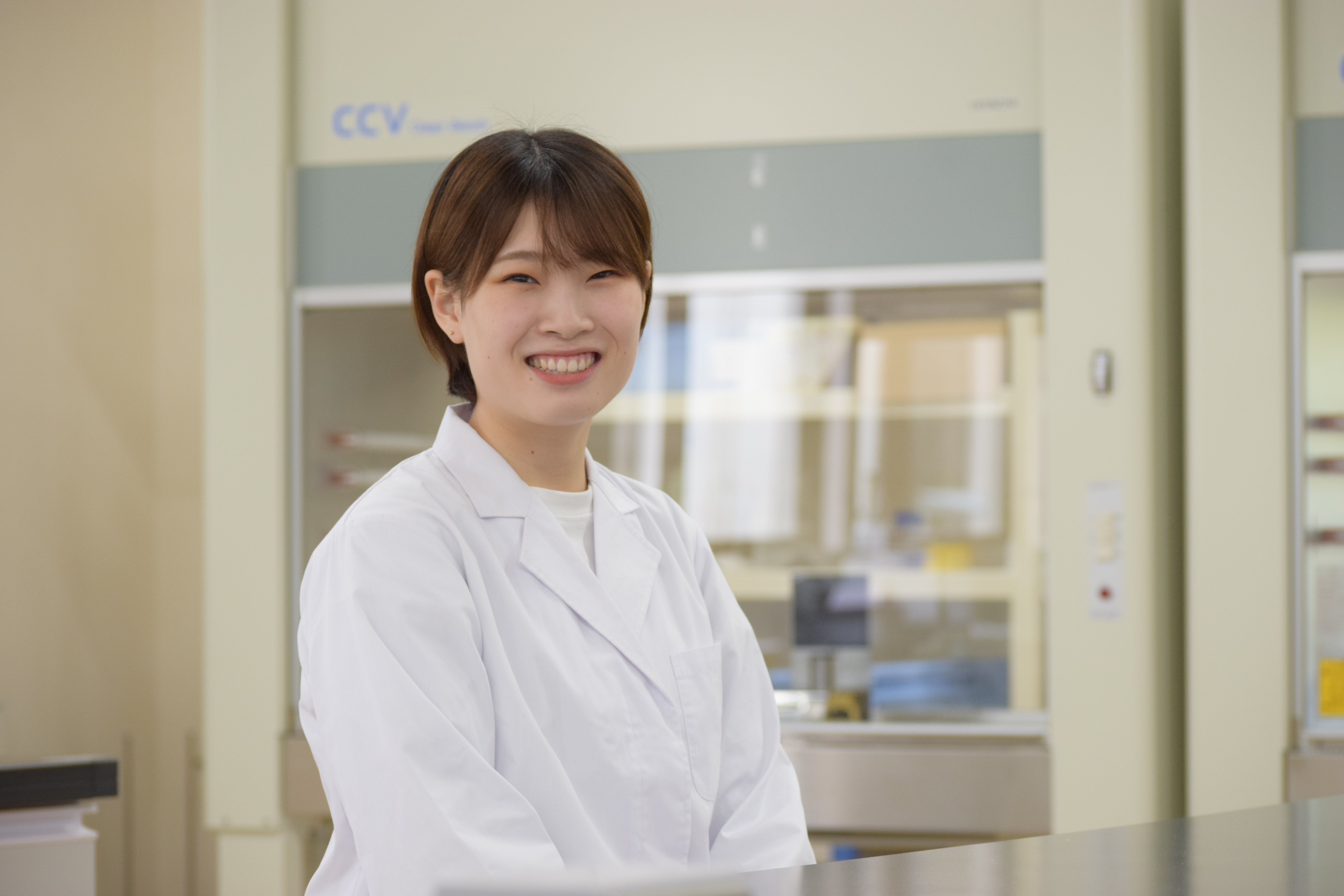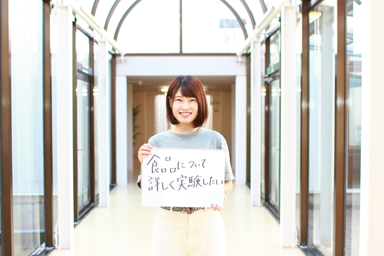 私は食品の成分について研究したいと思い、本学に入学しました。1年次の「農学基礎実習」で初めて行った実験が面白く、この実験をきっかけにこれからも食品の成分や機能についてもっと学びたいと思い、フードコースを選択しました。